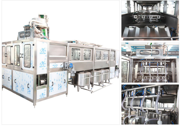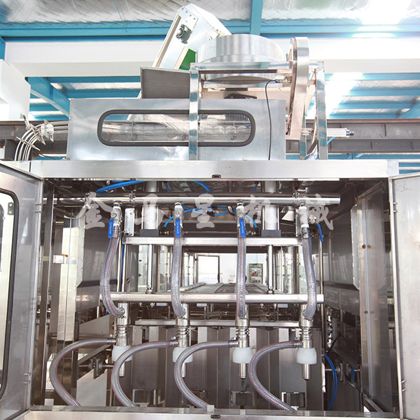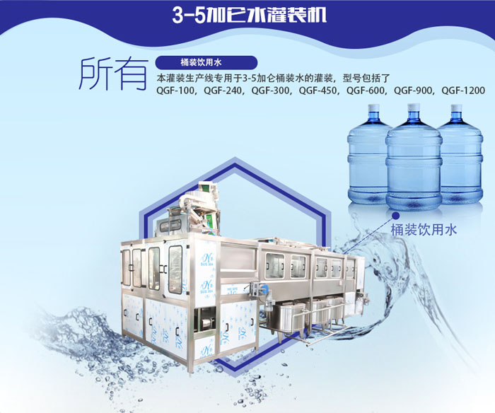 本灌裝生產(chǎn)線專用于3-5加侖桶裝水的灌裝,型號(hào)包括了QGF-100,QGF-240,QGF-300,QGF-450,QGF-600,QGF-900,QGF-1200。合沖洗、灌裝、旋蓋三為一體。沖洗機(jī)采用了多種洗液以及消毒液對(duì)瓶子進(jìn)行清洗以及消毒,消毒液能夠循環(huán)使用。瓶蓋會(huì)在清洗和消毒后運(yùn)至旋蓋機(jī)自動(dòng)進(jìn)行旋蓋。本產(chǎn)品功能齊全,涵蓋了清洗、消毒、灌裝、旋蓋、計(jì)數(shù)等功能,高度自動(dòng)化,實(shí)為飲料生產(chǎn)廠家理想的優(yōu)先設(shè)備。