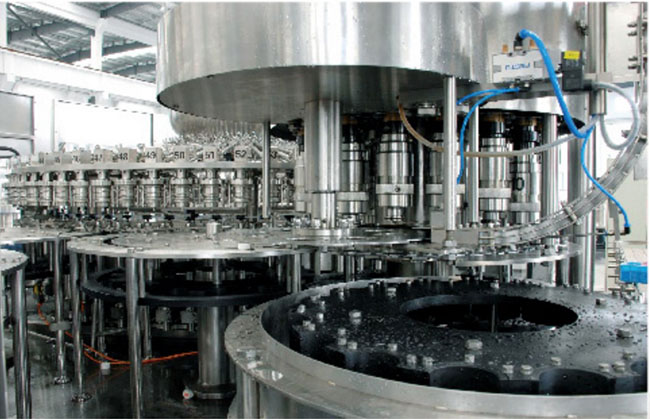 本設備主要用于含汽飲料灌裝,包含沖瓶灌裝和旋蓋三大主要功能。本設備實現全自動運行,能夠適應PET瓶含汽果汁、含汽礦泉水及可樂與雪碧等灌裝。瓶型適應性強,更換瓶型時操作簡單快捷。灌裝方案中采用了等壓灌裝原理,灌裝快速穩定,液位準確,含汽量足。與同類設備相比,本公司產品產量高,運行穩定安全,故障率低,自動化長度高,價格經濟實惠。全機采用優良可編程控制器(PLC)來控制設備的自動運行,送瓶系統由變頻器改變速度,更加穩定可靠。每個部分都有光電單元進行監測,所以更加自動化,操作更加便捷。在此基礎上,更換灌裝單元即可改變灌裝模式到低壓真空灌裝和等壓灌裝等。本設備是飲料企業的選擇。