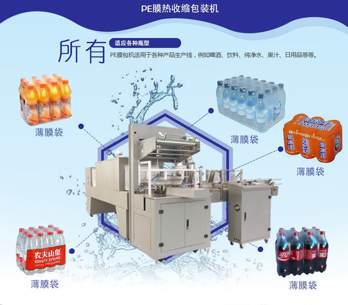 PE膜包裝機適用于包裝易拉罐、瓶子,同時適用于有無瓶底托兩種情況。主要工作在收縮通道中進行。此設備采用德國優良技術和國際知名品牌部件,產量穩定、使用壽命長久。