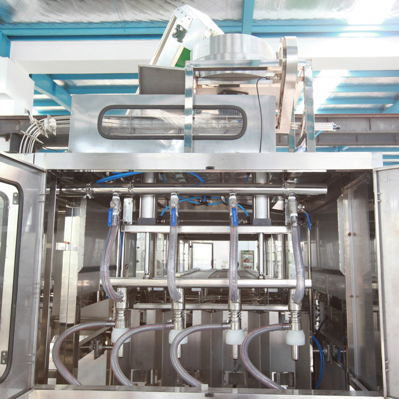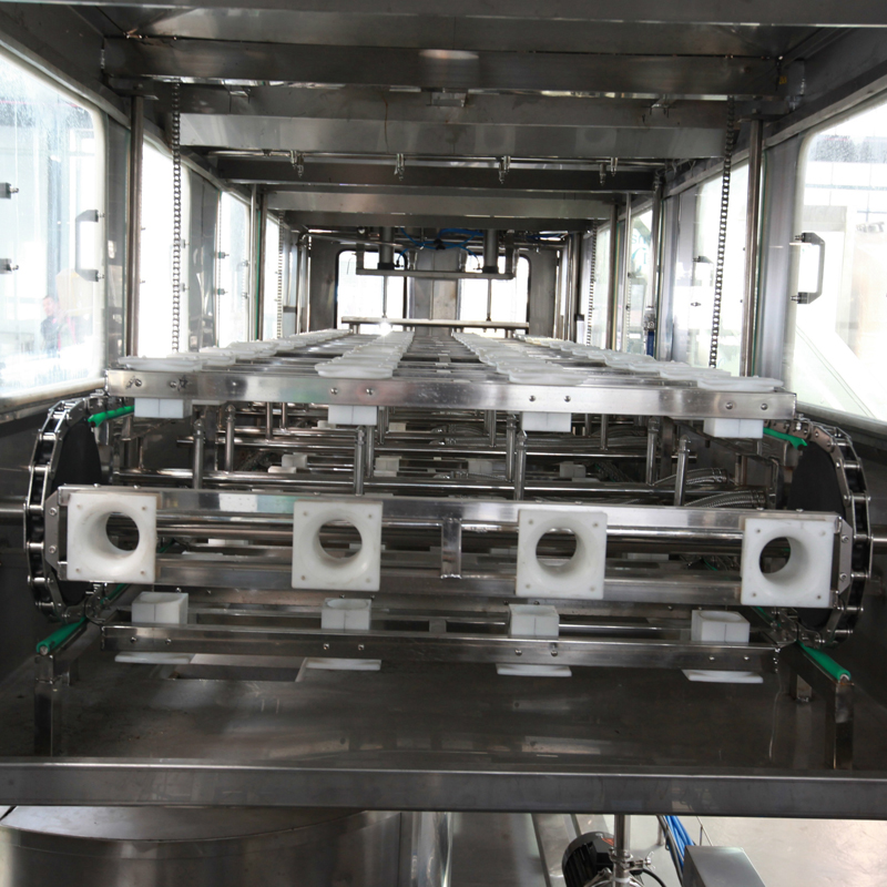 本灌裝生產(chǎn)線專用于3-5加侖桶裝水的灌裝,型號包括了QGF-100,QGF-240,QGF-300,QGF-450,QGF-600,QGF-900,QGF-1200。合消毒、沖洗、灌裝、壓蓋四為一體。沖洗機采用了多種洗液以及消毒液對瓶子進行清洗以及消毒,消毒液能夠循環(huán)使用。瓶蓋會在清洗和消毒后運至旋蓋機自動進行旋蓋。本產(chǎn)品功能齊全,涵蓋了清洗、消毒、灌裝、旋蓋、計數(shù)等功能,高度自動化,實為飲料生產(chǎn)廠家理想的優(yōu)選設備。