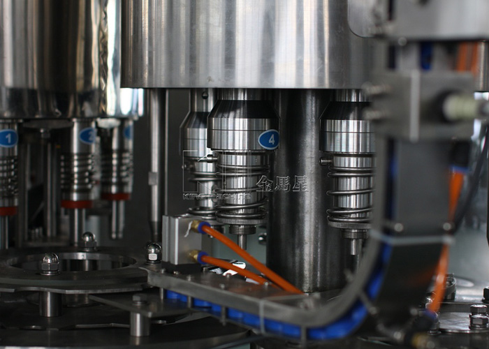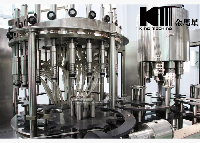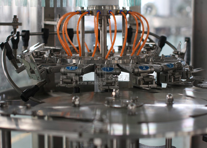 從沖瓶系統(tǒng)過(guò)來(lái)的瓶子經(jīng)撥瓶星輪撥至灌裝系統(tǒng)的托瓶頸裝置上,并隨回轉(zhuǎn)底座順時(shí)針旋轉(zhuǎn),瓶托沿凸輪導(dǎo)軌上升將空瓶托起,在托瓶頸裝置里的彈簧力作用下瓶口與灌裝閥閥座封嚴(yán),然后開始灌裝。灌裝分為四個(gè)過(guò)程:開閥進(jìn)氣、進(jìn)液回氣、液滿關(guān)閥、放氣回位。灌裝完畢后,實(shí)瓶開始下降至起始高度,然后由灌裝封口轉(zhuǎn)瓶機(jī)構(gòu)的撥瓶星輪沿弧形導(dǎo)瓶板送至封口機(jī)構(gòu),進(jìn)行封蓋。