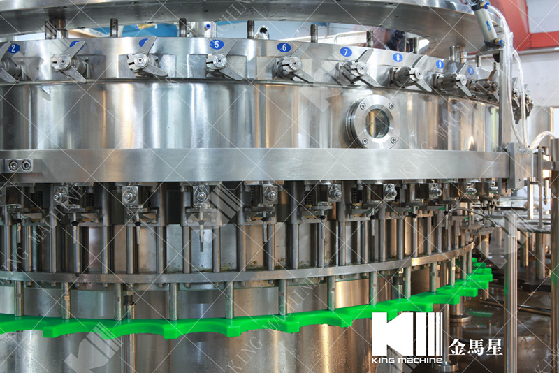 本機主要用于飲料的灌裝作業。本機將洗瓶、灌裝、封口三功能合在一個機體上,全過程實現自動化、適用于聚酯瓶、塑料瓶灌裝礦泉水、純凈水,加上溫控裝置還可以進行熱灌裝。各部分的適用瓶型調整采用手柄轉動實現,輕松自如,簡便快捷。灌裝方式采用了新型的微壓灌裝,使灌裝速度更快更穩定,所以同規格的機器相比本機的產量更高,效益更大。本機采用了優良的OMRON可編程控制器(PLC)控制機器的自動運行,進瓶鏈道采用變頻器調速,與主機變頻器的調速相互配合使進瓶運行更穩定可靠。光電檢測各部件的運行狀況,所以自動化程度高,操作簡便。在此基礎上,本機變更灌裝部分;可以形成低真空灌裝方式和等壓灌裝方式。低真空灌壓方式(Z型機),適用于玻璃瓶,灌裝酒類、醬油等物料,其封口方式可以選配鋁金屬防盜蓋和塑料蓋。等壓灌裝方式(Y型機)適用于聚酯瓶,塑料瓶灌裝含汽飲料,是飲料生產廠家理想的優選設備。